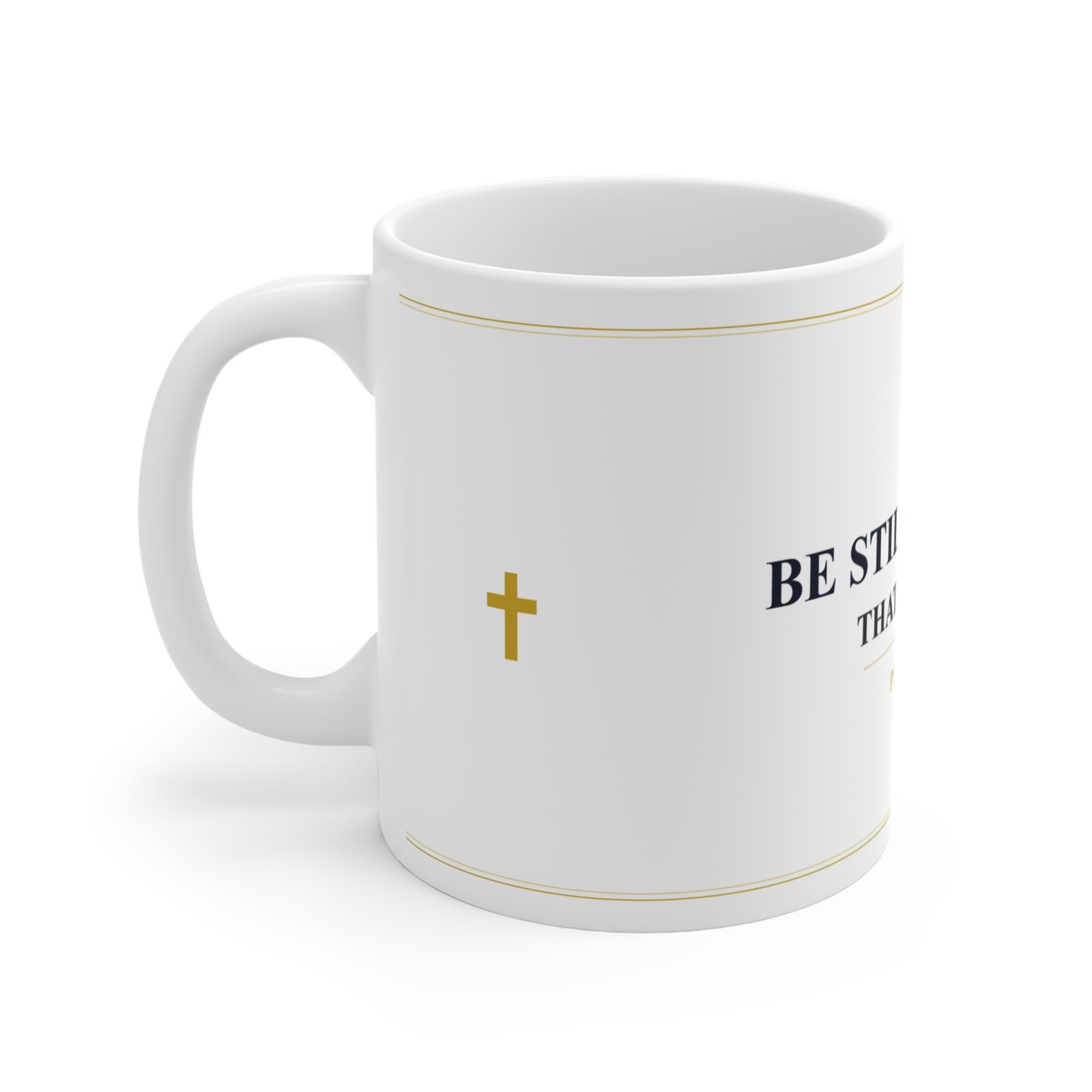 Start your morning with faith. Panoramic wrap with “Be Still & Know,” golden cross, and ornate borders. Psalm 46:10.