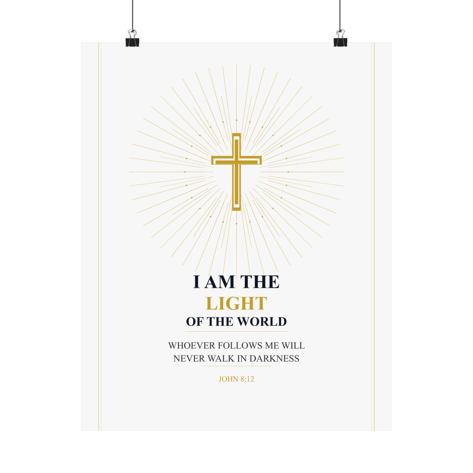 “I am the light of the world” — John 8:12. Cathedral-inspired design with radiant golden cross.