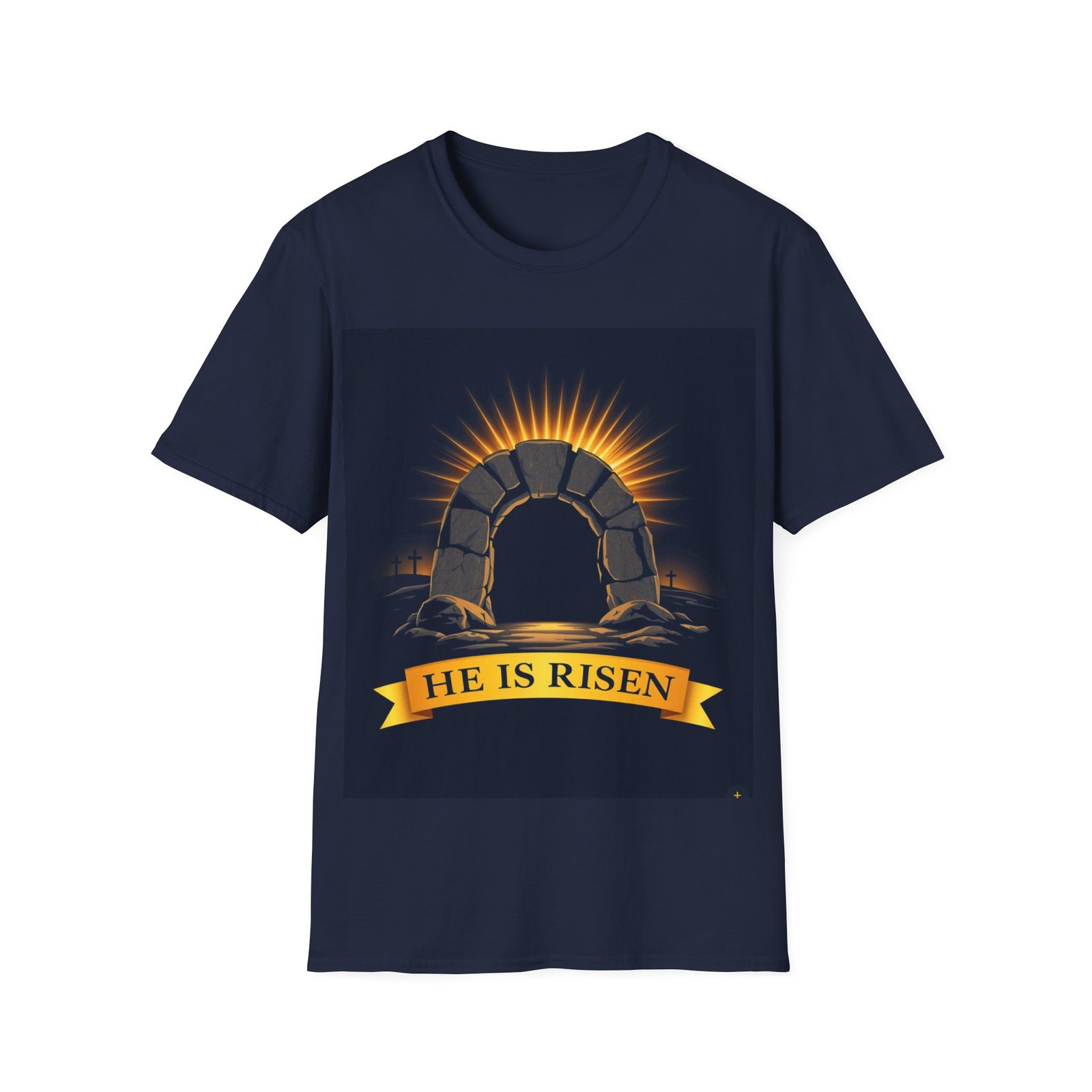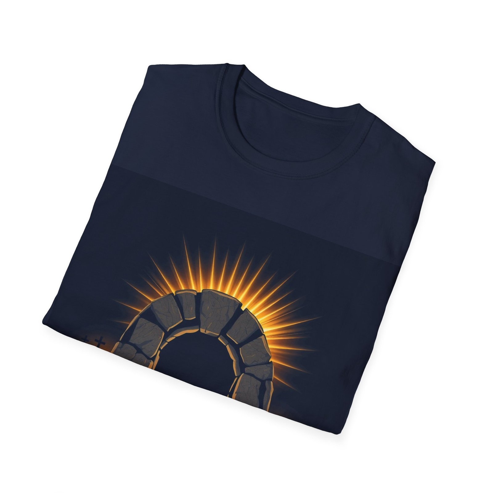 Celebrate the risen Christ with this stunning Easter t-shirt featuring a cinematic empty tomb at dawn with radiant golden light. The powerful “He Is Risen” banner proclaims the resurrection message in bold, premium style. Perfect for Easter Sunday service, family gatherings, or everyday wear as a bold declaration of faith.