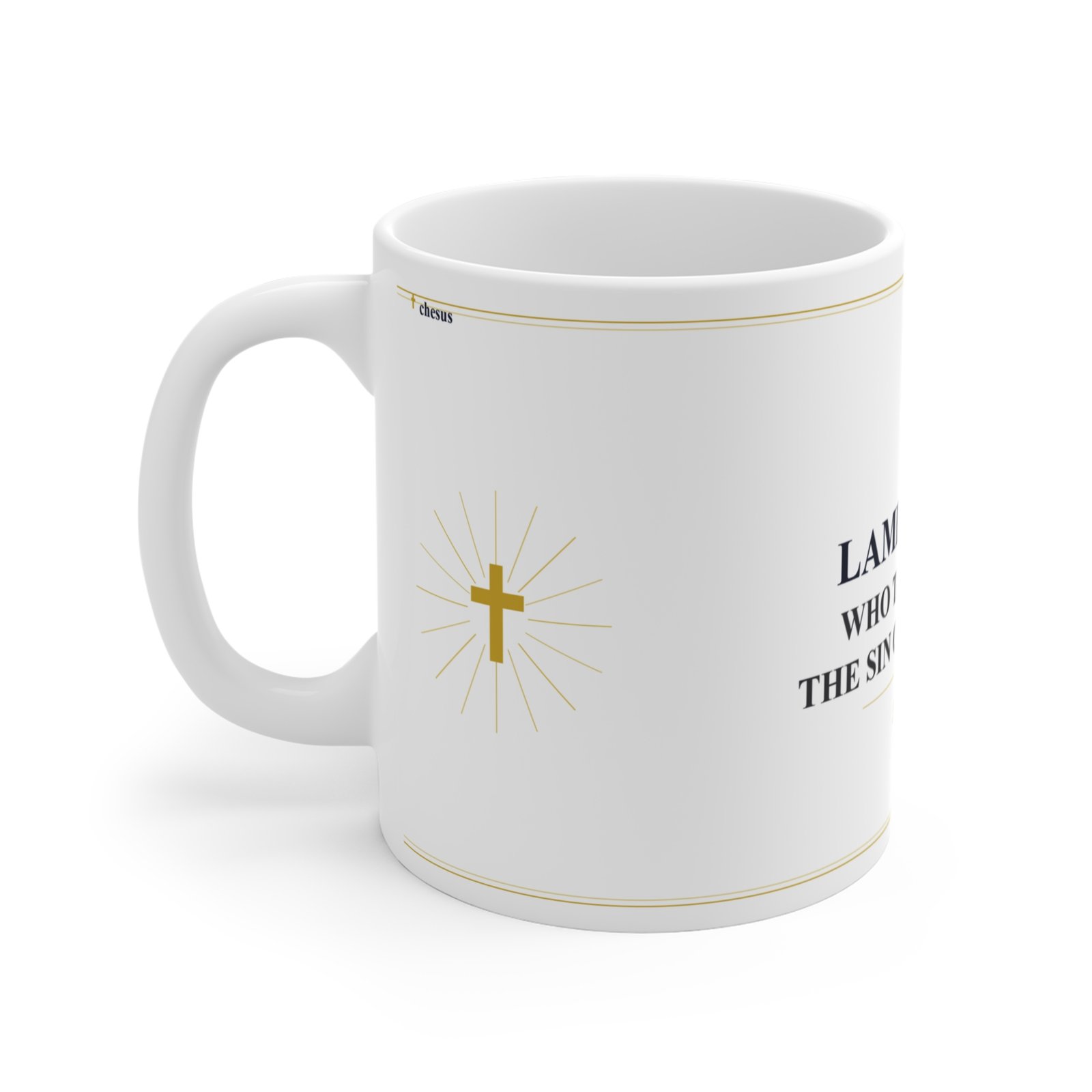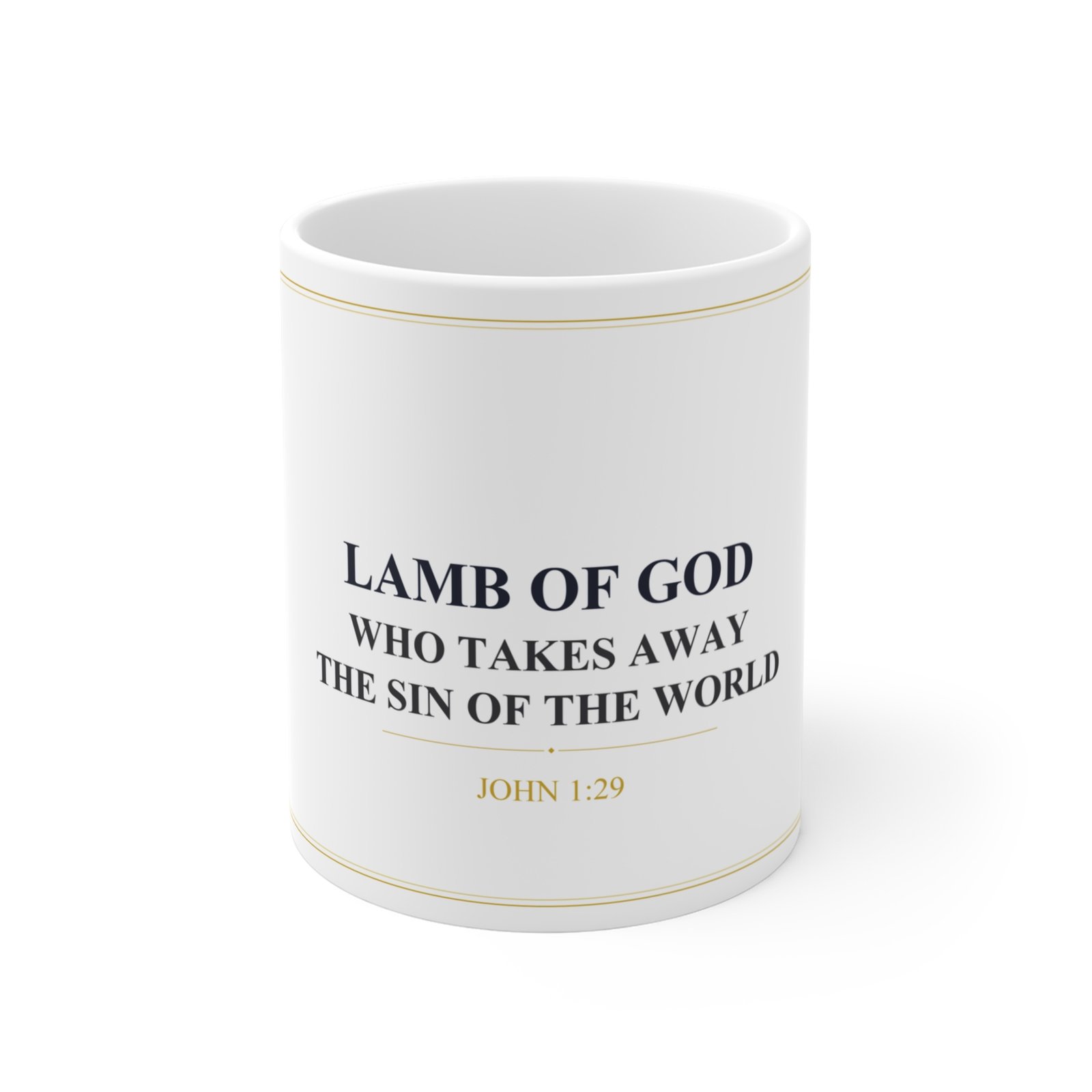 Behold the Lamb of God who takes away the sin of the world. 11oz ceramic mug with premium print. John 1:29.